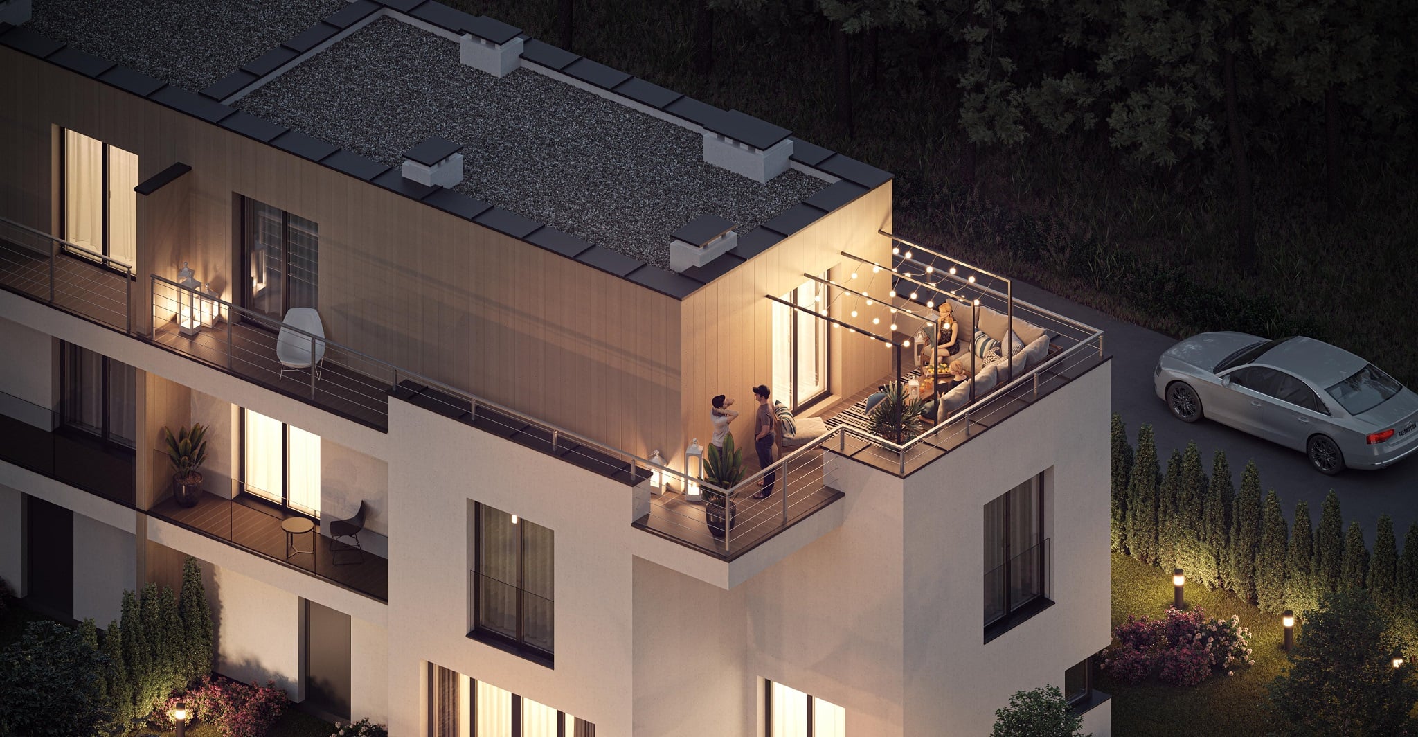 - W każdym lokalu duży balkon na 1 piętrze oraz przestronny taras okalający na poddaszu